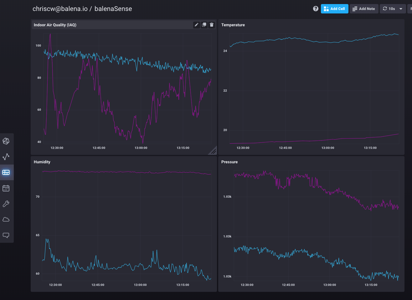 Grafana, and you can do the same thing here. You'll need to install Grafana or Chronograf standalone, typically this is done on the same host as your InfluxDB server, but it doesn't have to be. Both Grafana and Chronograf play nicely with InfluxDB and will allow you to present the information in the same way as the standalone version of balenaSense, with the added benefit that you can now plot and compare data from multiple sensors at once - brilliant!