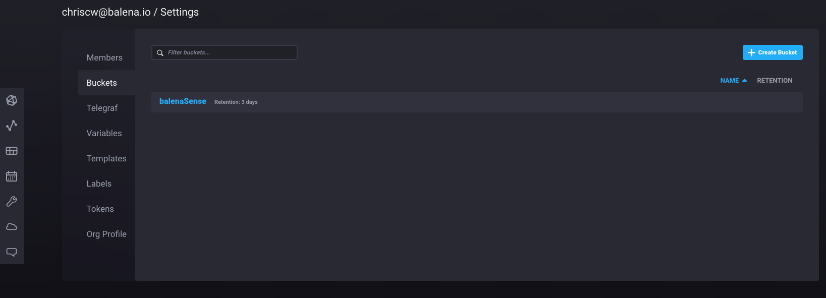 Next, go to settings and create a bucket. I’ve called my bucket balenaSense; we’ll need to remember this for later.