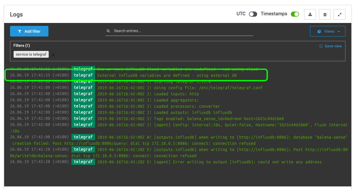 If everything has been set up correctly, you should see the following in the logs for your device on the dashboard when the Telegraf container starts:
