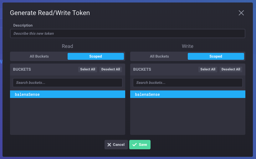 After that, go to tokens and generate a new Read/Write token. This is used to authorize your balenaSense device with your InfluxDB cloud account. You can use the same token for all your devices, you just need to ensure that the token has read/write access to the bucket you created a moment ago. The description is not important here and only for your reference, I called mine balenaSense RW.