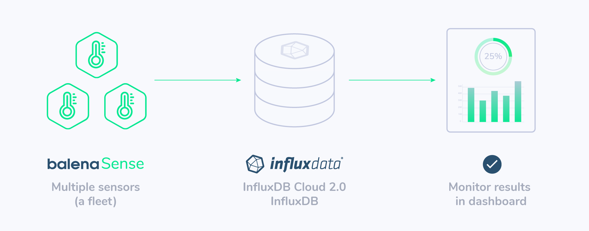 We looked at two ways to feed the data from a fleet of balenaSense devices into a central database; InfluxDB Cloud 2.0 and a standalone InfluxDB instance. This enables you to pull data from several sensors which may be in different locations into a single dashboard, as well as taking advantage of the fleet-management aspects of balenaCloud, which allows you to manage and update all devices simultaneously.