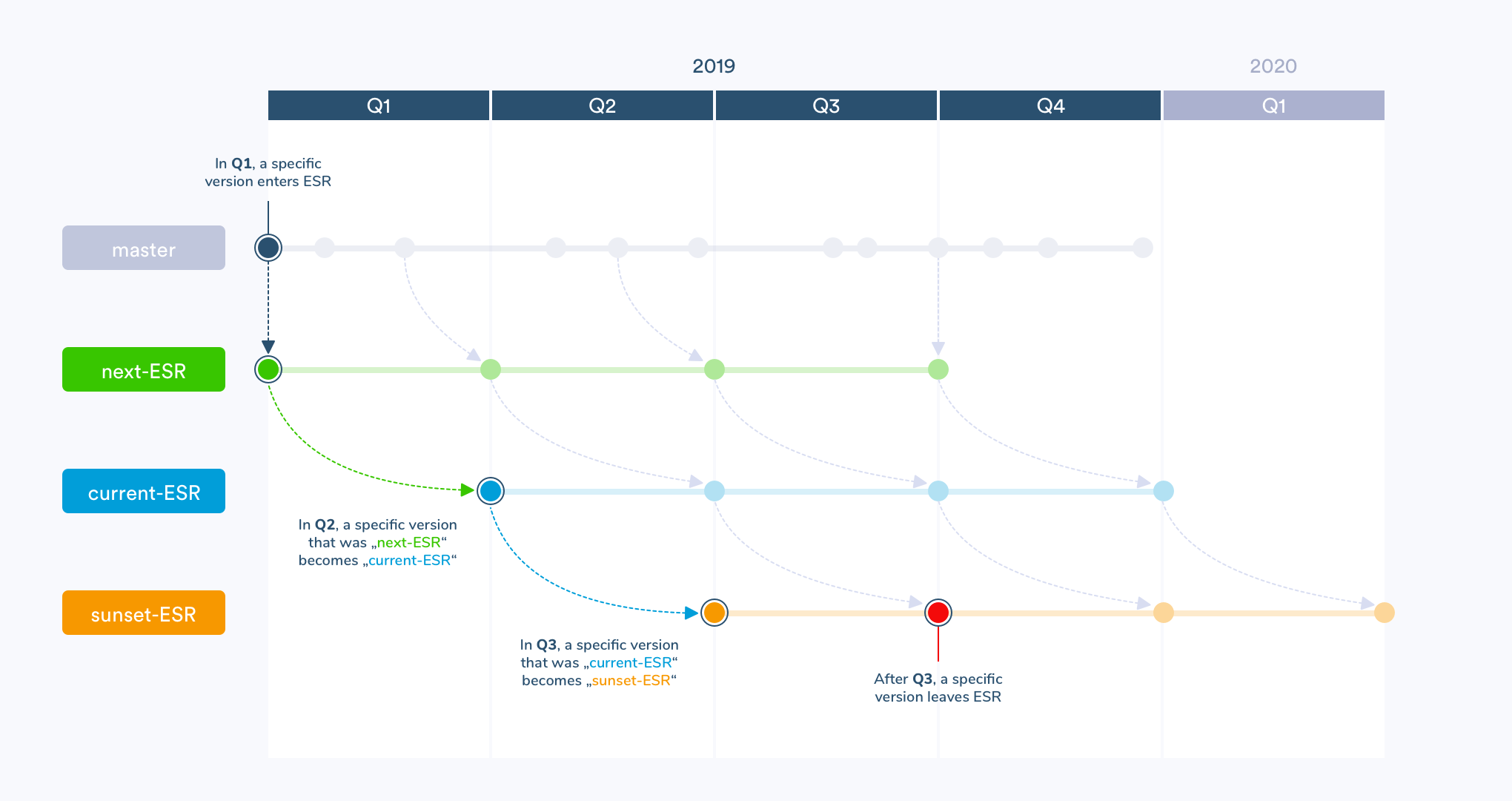 Here’s a generalized way to read the diagram. A master version is chosen to become the next-ESR, then three months (or one quarter) later, it becomes current-ESR, and then a quarter after that, it becomes a sunset-ESR.