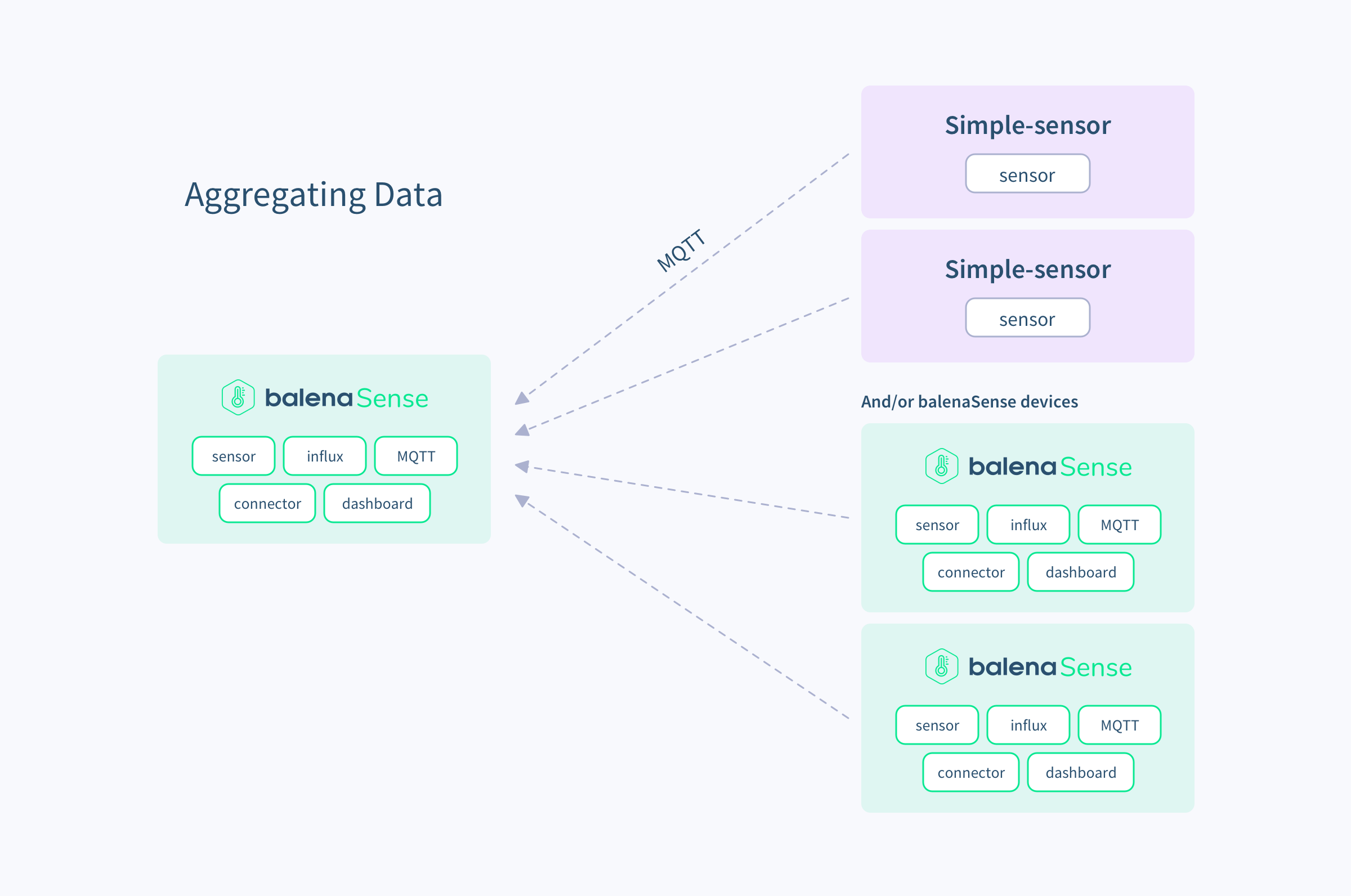 While you could run balenaSense on multiple devices to aggregate your readings, we have a simpler project you can deploy to send data to a balenaSense instance. It uses just the sensor block component to send connected sensor readings via MQTT, a lightweight messaging protocol often used in IoT projects. The benefit of using the simple-sensor project is that it uses less resources on the device (and less SD card wear) and unlike balenaSense, it runs on a Raspberry Pi Zero. You can use the button below to deploy the simple-sensor to your device(s):