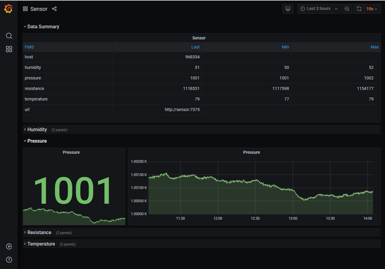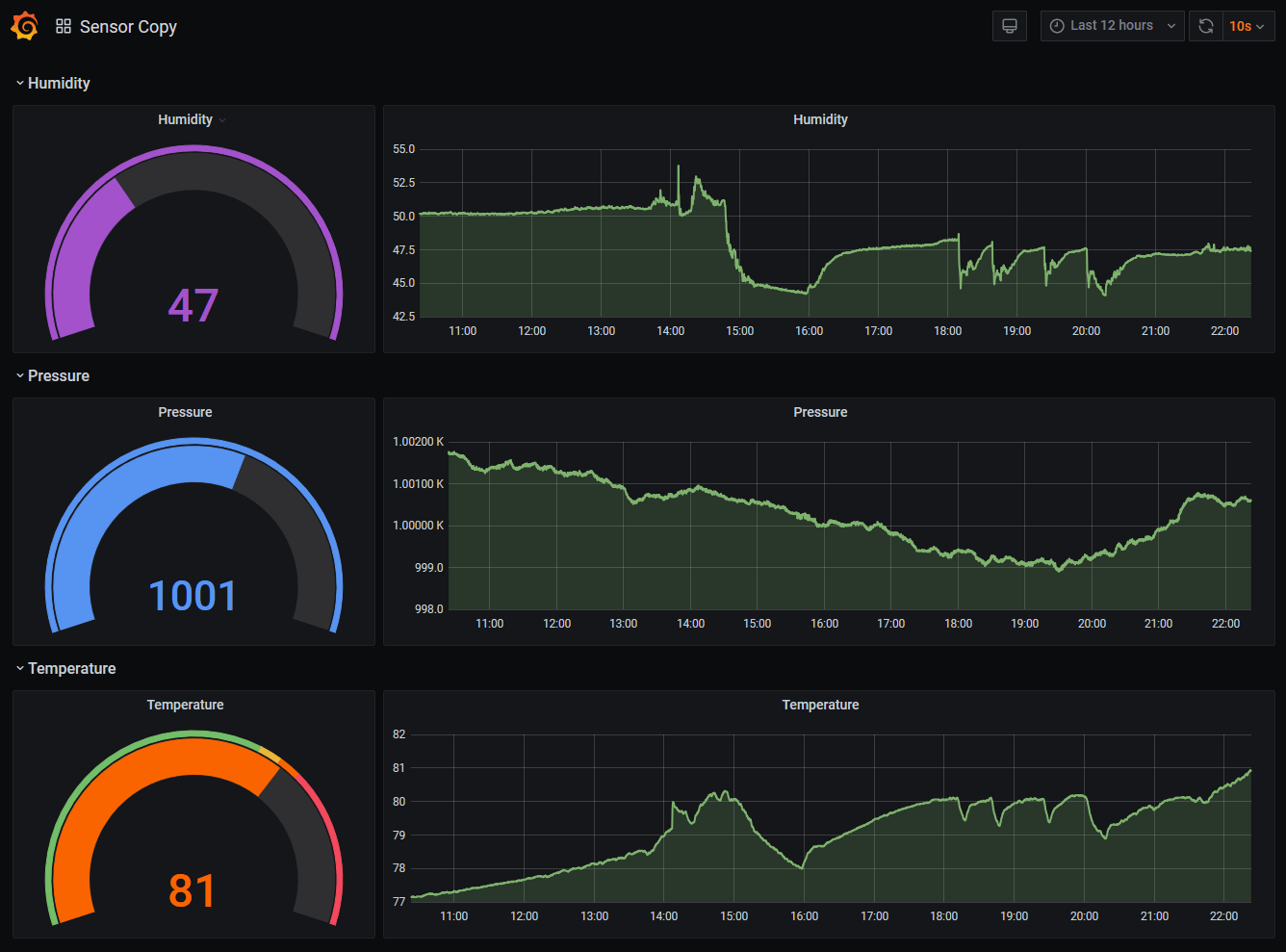 This will allow the connector to find all of the new data from the other sensors and start saving it in the master device’s InfluxDB database. Now that the data is available in one database, we can construct a dashboard to compare similar sensor data from multiple devices.