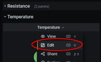 To edit any panel in the dashboard, click the down arrow next to the reading name (such as “Temperature”) and click “Edit.” Changes to your dashboard are not saved automatically so if you make a mistake you can reload the page and everything will revert to how it was. If you make some changes you want to keep, hit save at the top of the dashboard and all of your settings will be saved to your device.