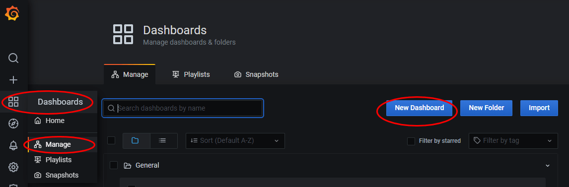 On the master device, go ahead and open Grafana and sign in if you haven’t already. Click on the dashboards tab icon on the left (the four squares), select “Manage” and then click on the blue “New Dashboard” button.