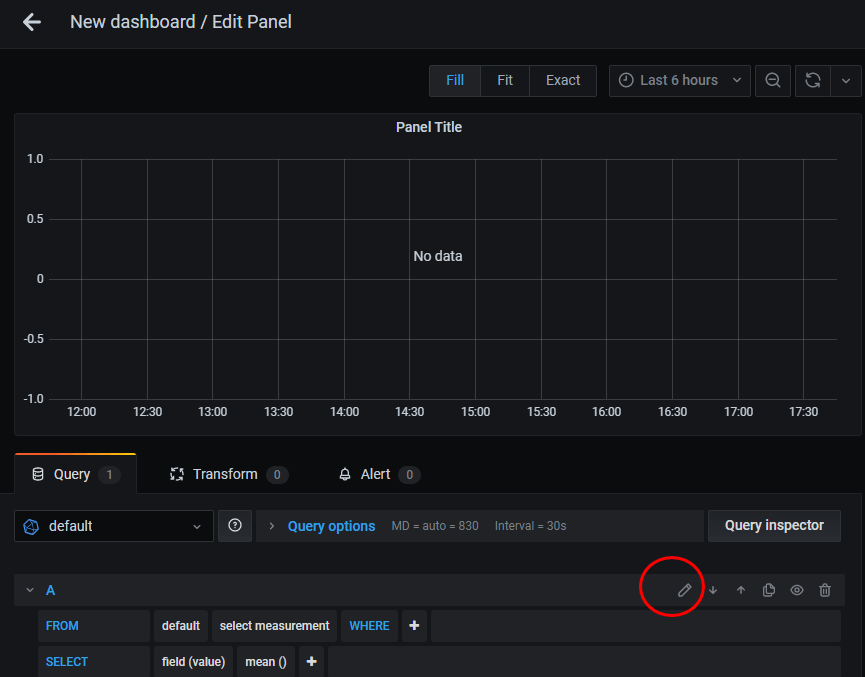 Click “Add new panel” and then at the bottom of your new dashboard page, click the pencil icon to toggle the query text edit mode. (Although we can build a query with the handy visual editor, it will be easier in this tutorial to enter it textually.)
