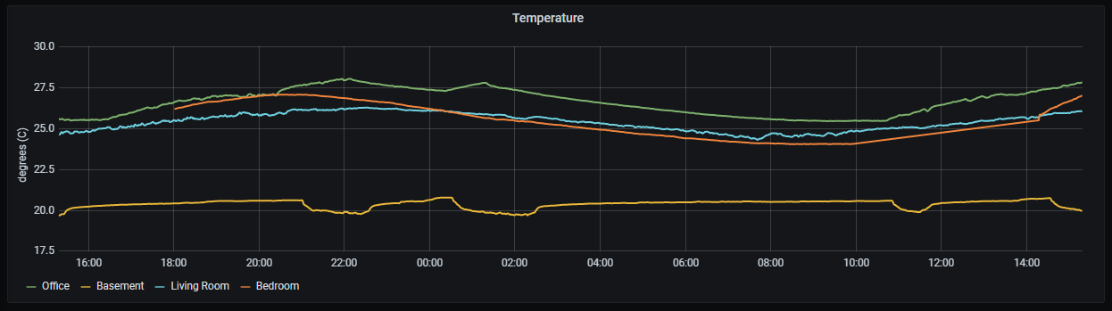 This will create a second query with the same text as our first query. Simply replace the short_uuid value in the second query with the short UUID from the next device you want to graph, and then add a new alias value. You can repeat this step as many times as you want. You can even add other measurements by changing the mean(“temperature”) text to some other valid measurement for your sensor, such as mean(“humidity”).