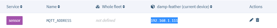 Add a service variable named MQTT_ADDRESS for the sensor service with the value being the IP address of the Home Assistant device. In other words, if your Home Assistant device’s IP address is 192.168.1.111, then the balenaSense device(s) would have a variable that looks like this: