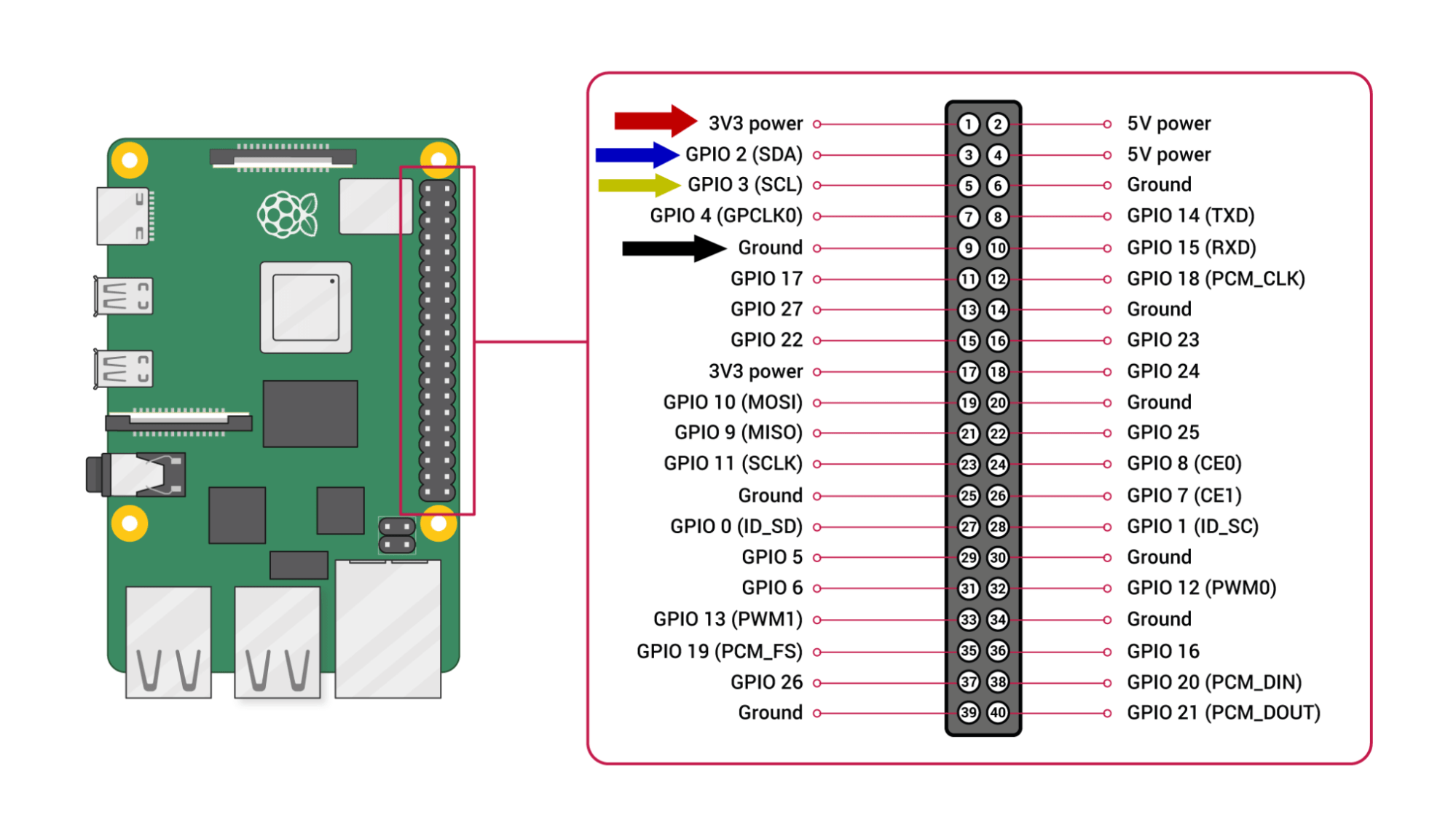 All of the supported sensors utilize a two wire serial communications bus called I2C (“eye-squared-see”) so the connection is easy. In addition to the two communication wires, there are also two power connectors for a total of four wires. The diagram below shows the typical color codes (in the arrows) for the wires that connect the sensors to the Pi.