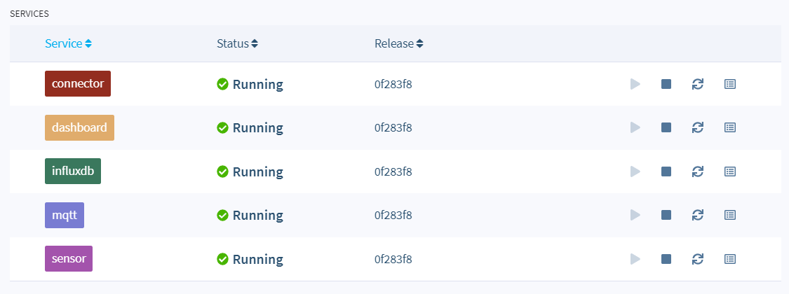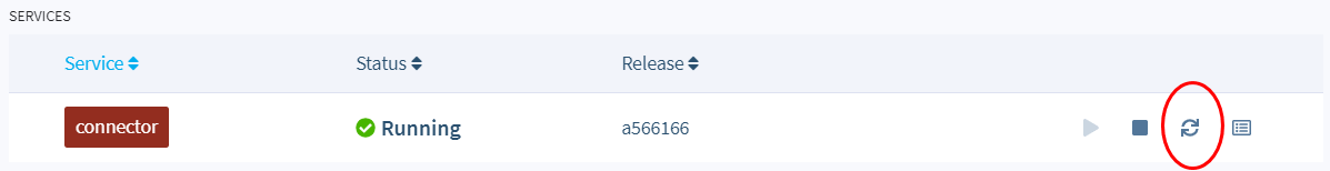 Once all of the variables have been set on all of the devices, click the restart icon on the connector service in the “Services” section of the balenaCloud dashboard.