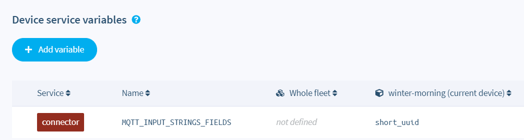 Since balenaSense already uses MQTT to transfer data, we only need to change a few settings to aggregate data from other MQTT sensors. On the master device, go to the “Device service variables” tab in your balenaCloud dashboard and add a service variable named MQTT_INPUT_STRINGS_FIELDS to the connector service with a value of short_uuid. The page should look similar to this after adding the variable: