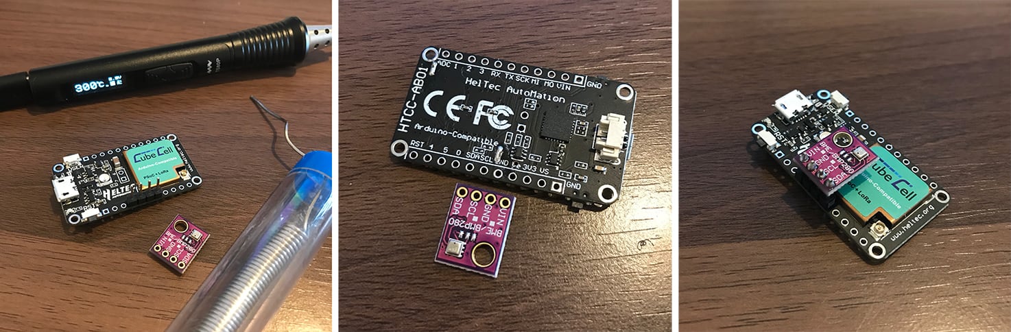 Heltec CubeCell HTCC-AB01 dev board for this project, since it’s a relatively cheap way to get up and running with LoRa nodes. We’ll connect the BME280 sensor and then flash the board with the project firmware.