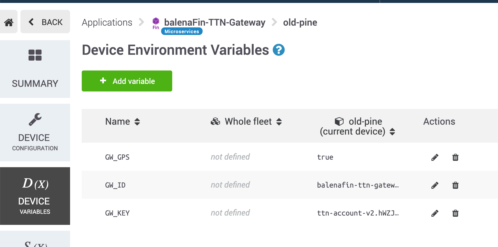 device variables page within your balenaCloud application. These variables are set on a per-device basis, as each gateway will have its own unique key and ID.