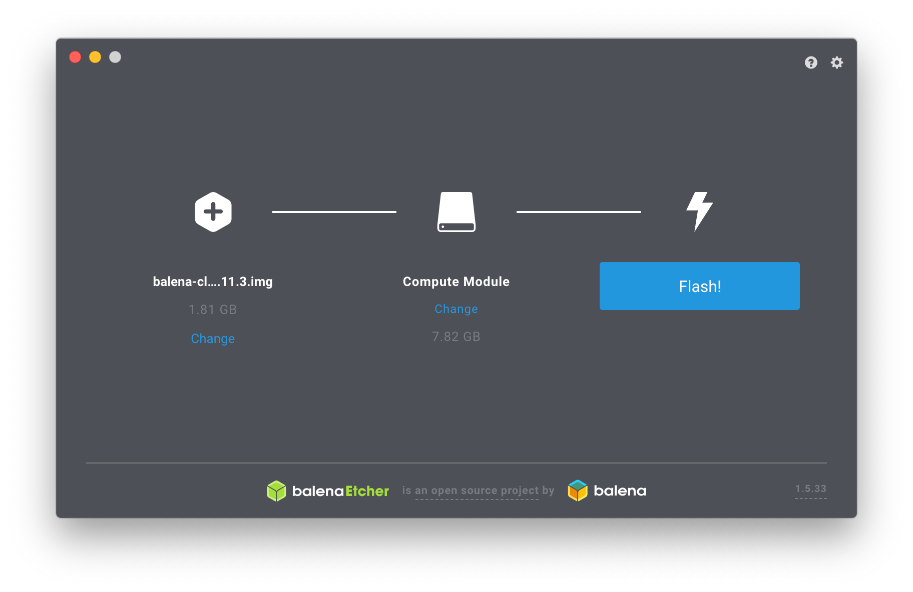 Etcher to flash your balenaFin with the downloaded OS image. Connect your Fin to your computer using a micro USB cable - note that if you have a Fin v1.1 a separate power supply is not required for flashing! Otherwise you first need to connect the USB cable and then connect a power supply to make the Fin enter flashing mode. When everything is working correctly, you’ll see that the Fin is shown as a ‘Compute Module’ in Etcher (as shown below).
