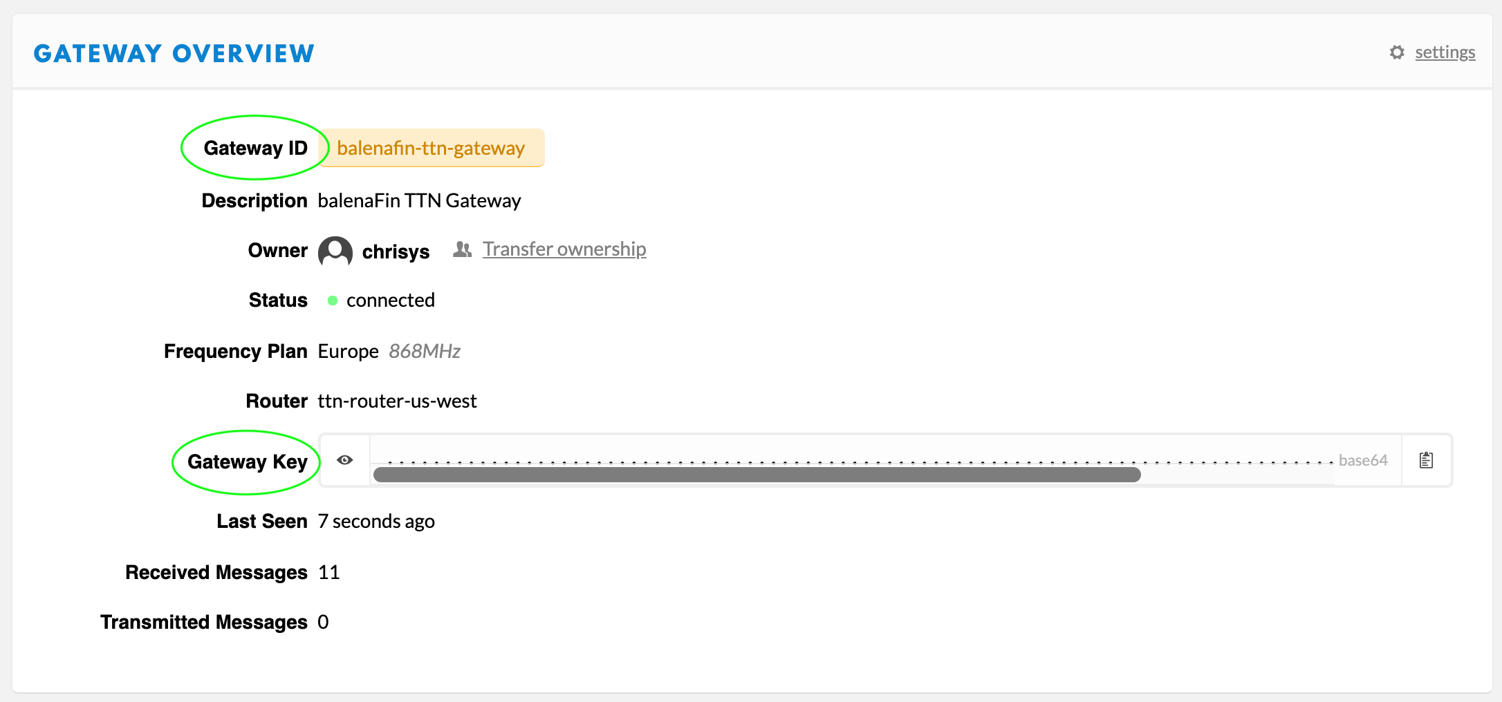The variables you’ll need to add are GW_GPS = true (assuming you’re using the optional GPS!), GW_ID for the gateway ID and GW_KEY for the gateway key. These are found on the gateway overview page within the TTN console (as below):