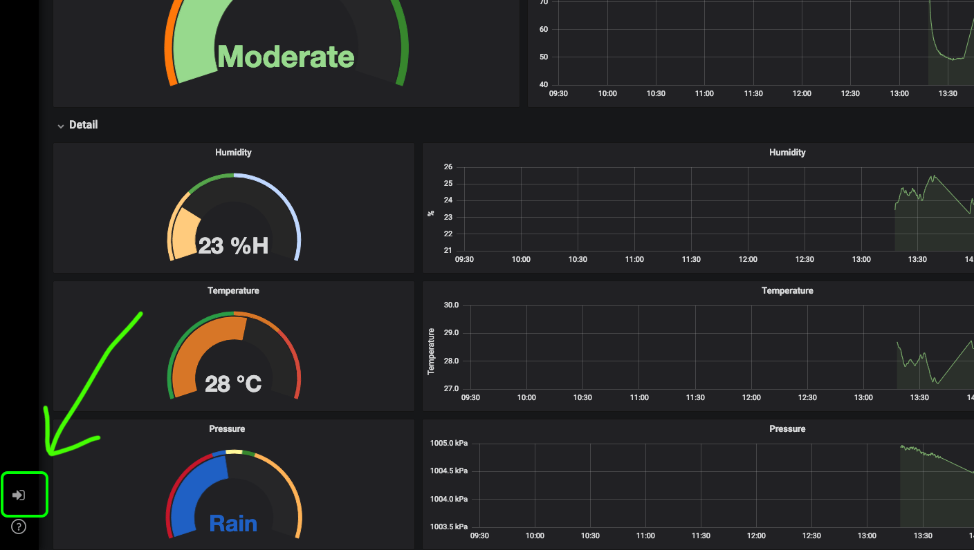 We’ve set the system up with a default username and password of admin and admin. You can change this by logging into Grafana using the button in the lower left corner of the dashboard; you’ll be prompted to change it upon first login.