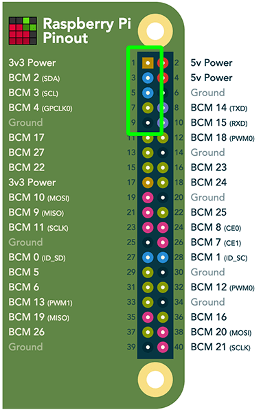 pinout.xyz; it clearly shows us that the pins we need are 1 (3V3 power), 3 (SDA), 5 (SCL), and 9 (Ground). The 40 pin GPIO header is standard across the Pi 2 and later. You’ll notice that if you’re using the Pimoroni board and solder on the included header, the pins are in exactly the right order to connect the boards together. Notice how the writing on the board matches the pins in the pinout diagram above.
