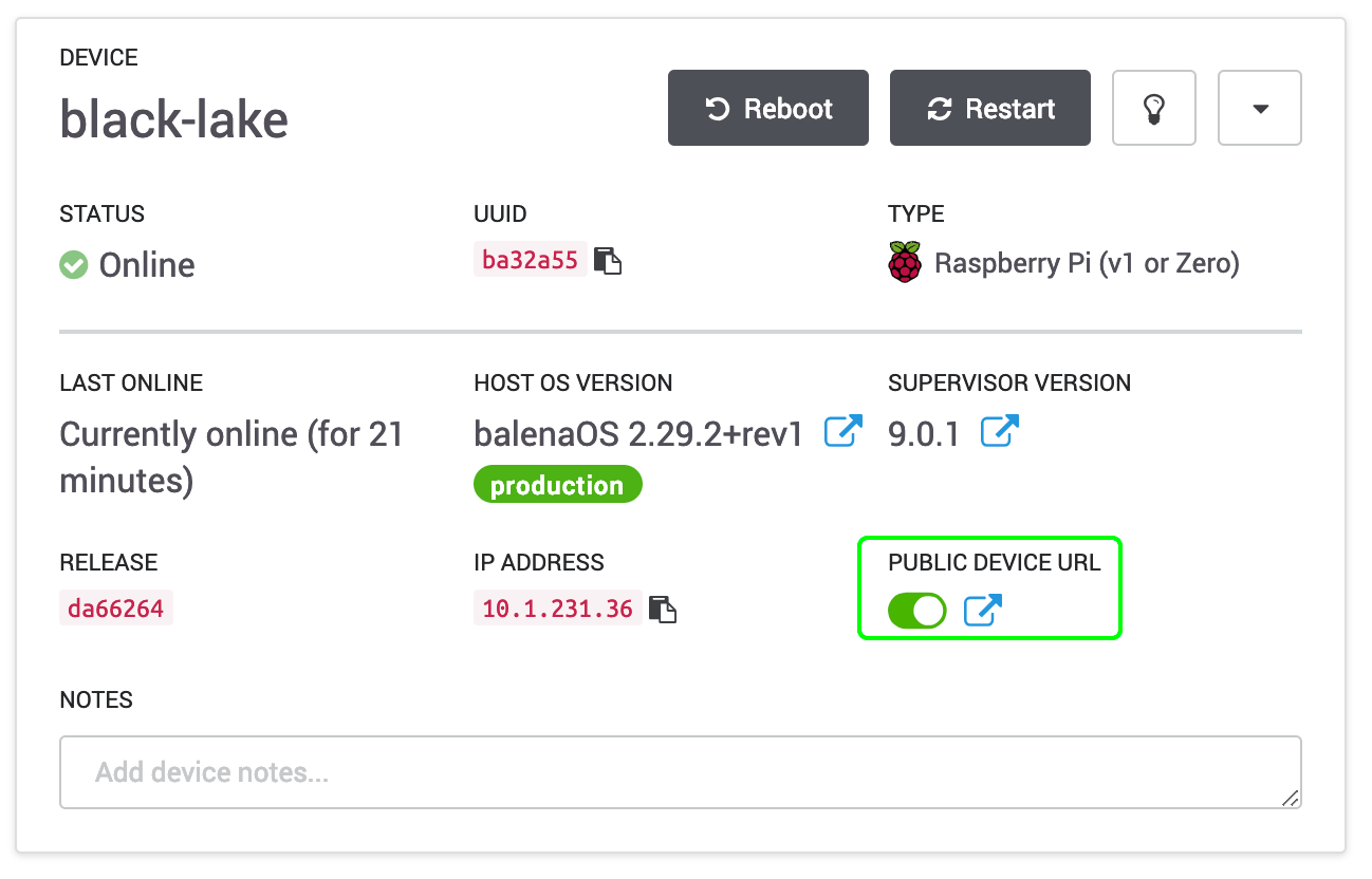 Hopefully you got your device flashed, connected to your network and up and running without too much trouble. One of the great benefits of using a free balenaCloud account is that you’re able to use the Public Device URL feature.