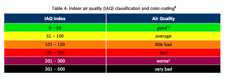 The BME680 sensor from Bosch gives us readings for temperature, humidity, pressure and a gas content reading provided in terms of resistance. The sensors for temperature, humidity, and pressure give us useful readings out of the box, but the gas resistance reading on its own is not a lot of use. It gives us an indication of the change in compounds in the air, so when the sensor application starts, it sets a baseline and monitors change. The air quality reading is given as a range from 0 to 500 where lower is better. See the table below for an idea of mapping, taken from the