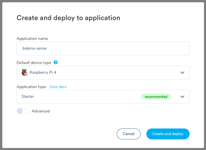 You can name the application whatever you'd like. Push Create and deploy and you'll see a new application with the name show up in the dashboard. Within this application, the balenaSense project and default environmental variables will be loaded.