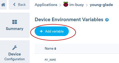 If you used an LED HAT or different GPIO pins than the ones in the instructions, (or a Raspberry Pi 1A or 1B) you’ll need to set a few device variables in the balenaCloud dashboard. This feature of balenaCloud frees us from having to edit any code or configuration files on the device.