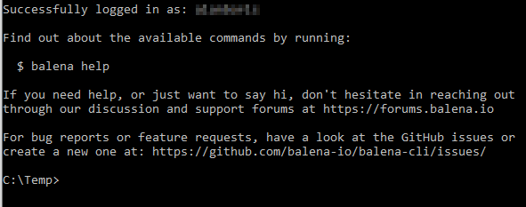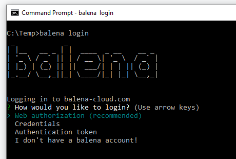 When you have the CLI installed and working, the first step is to login to balenaCloud by issuing the balena login command in the command prompt. (To access the command prompt in Windows, search for cmd in the “Type here to search” box near the start button.)