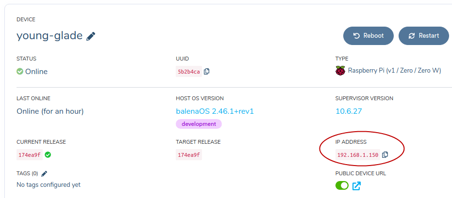 Now that you’ve set any required variables, it’s time to access the web page hosted on your device that will allow you to control the LEDs. Let’s just clarify that the LED Alerter page lives on your device and is used to control the LEDs for that device. This is in contrast to the balenaCloud dashboard pages which are hosted by balena and allow you to monitor and make changes to your device configuration via the cloud.