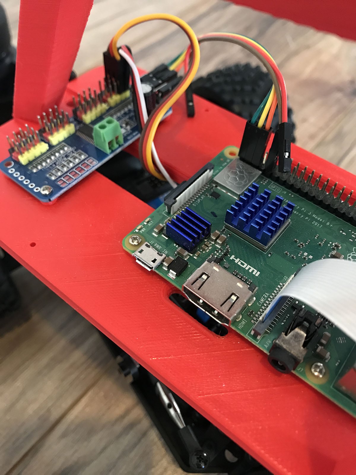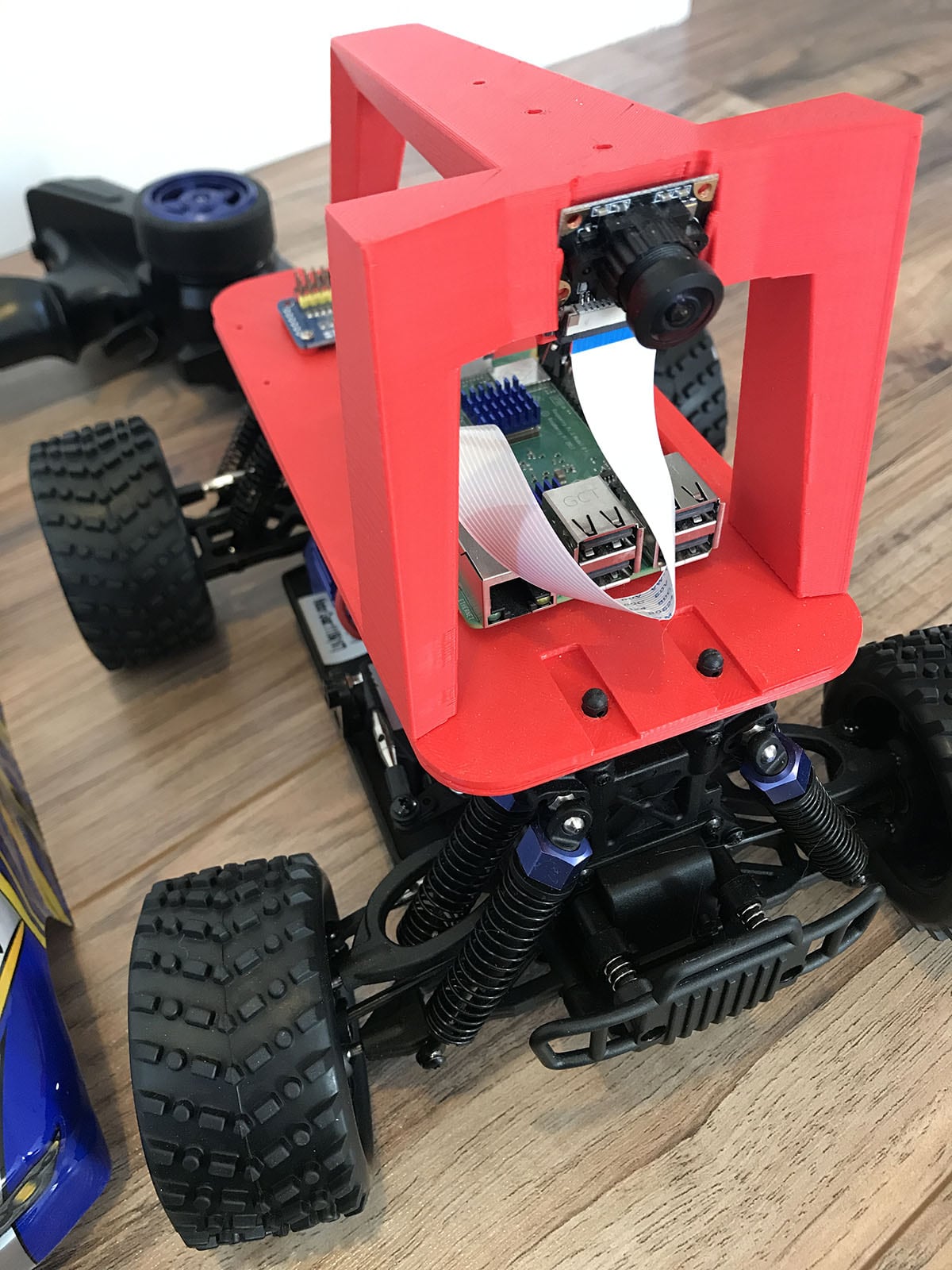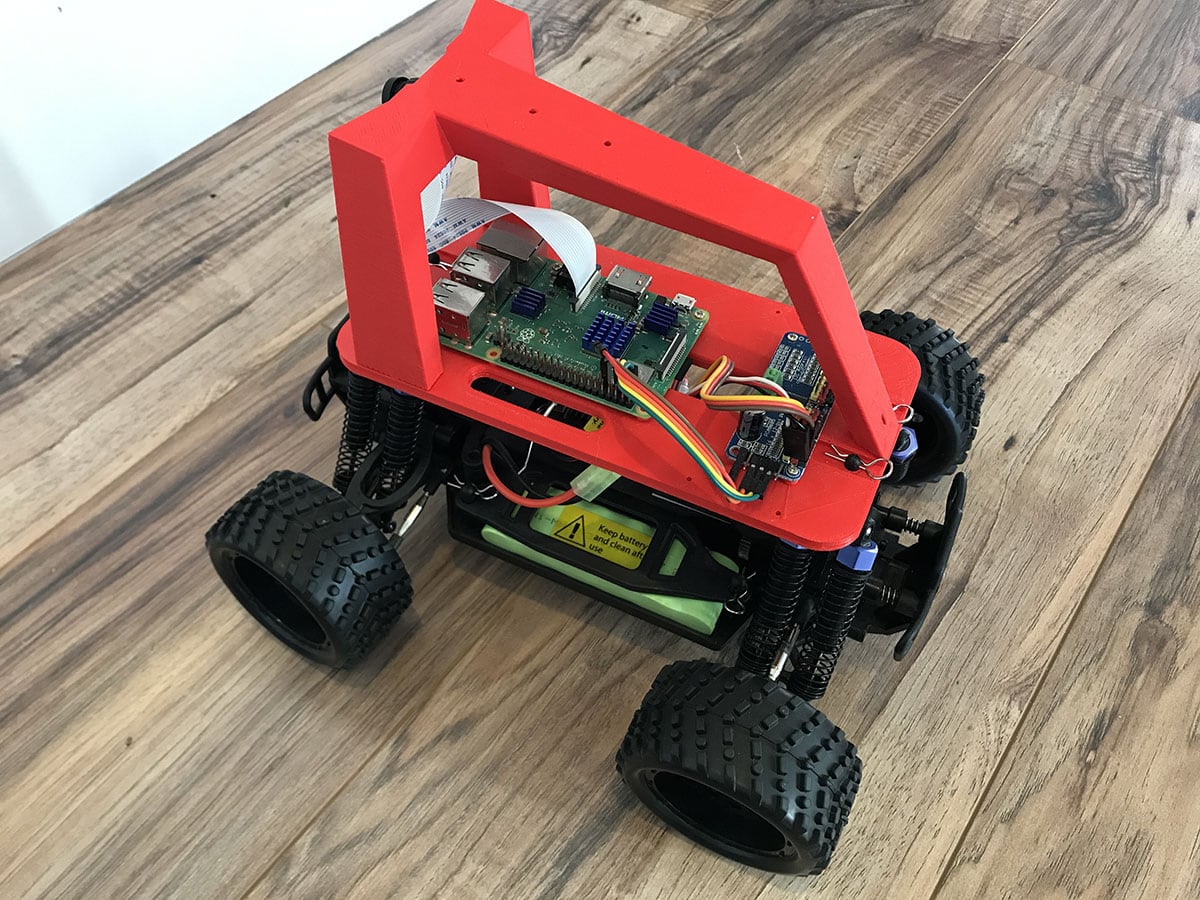 covered in detail in their Documentation. The basic premise however, is that you will remove the plastic car body from the RC Car chassis, and replace it with the DonkeyCar frame. Place the Raspberry Pi on the frame, the motor driver on the frame, and the Pi Camera in the holder slot near the top of the handle. Run the jumper wires from the Pi to the motor relay board. Connect the camera via it's ribbon cable. Secure everything in place with included screws, and the DonkeyCar is complete!
