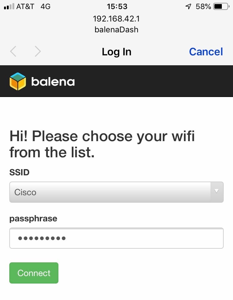 The captive portal interface should appear automatically when you connect from a mobile device, but if for some reason it doesn’t, you can access it by visiting the IP address of the device in a web browser using the device you've joined the balenaDash network with: https://192.168.42.1