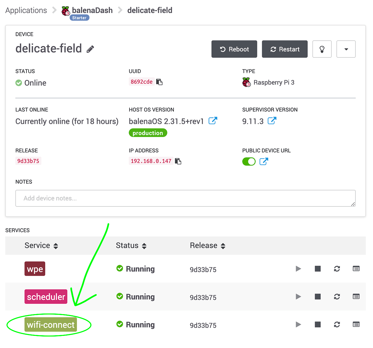 Once you've updated successfully you should be able to see the additional wifi-connect service showing on the device page in your balenaCloud dashboard.