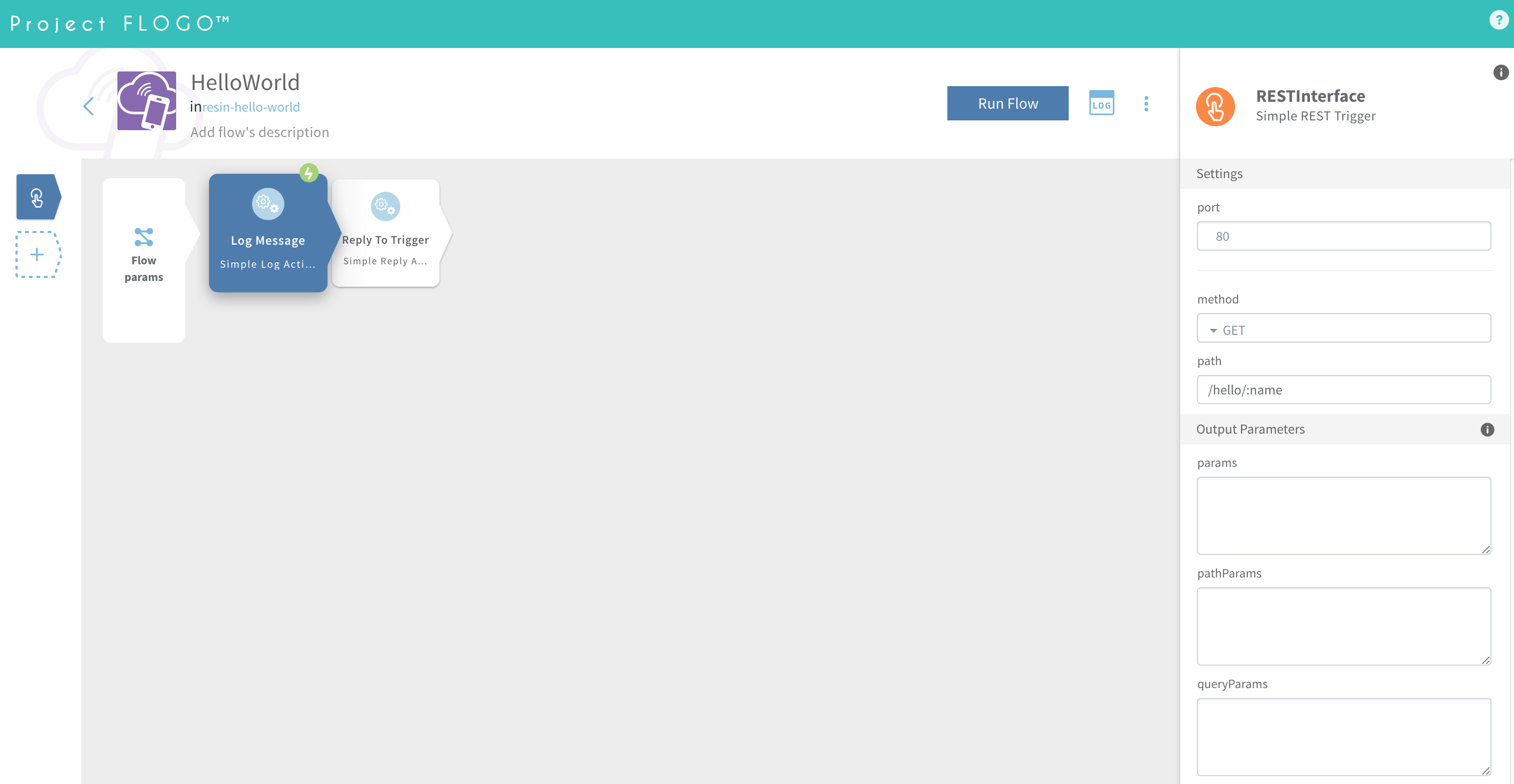Project Flogo is event-based. On the left side of the gray rectangle are the triggers, which define how events (and thus data) are collected from the external world. Here, I am using a REST trigger, but there are triggers for MQTT, CoAP, Kafka, and many more, and the community is constantly building new ones.
