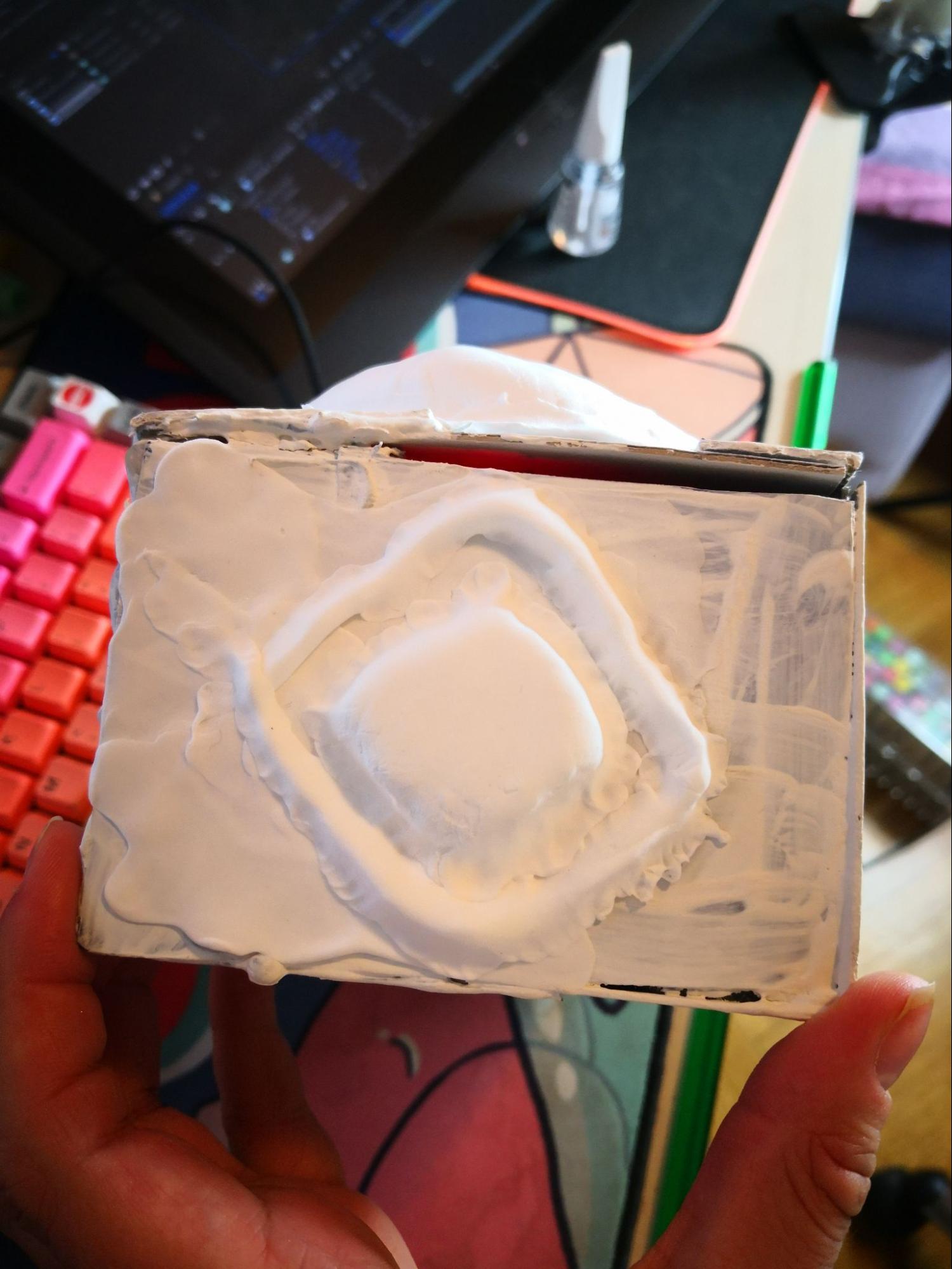 The “brick” case for this controller is still a work in progress. I built the frame for this box by repurposing a shoebox. I gessoed the box before adding clayfoam to sculpt the engraving for the spirit and the symbols in the game.