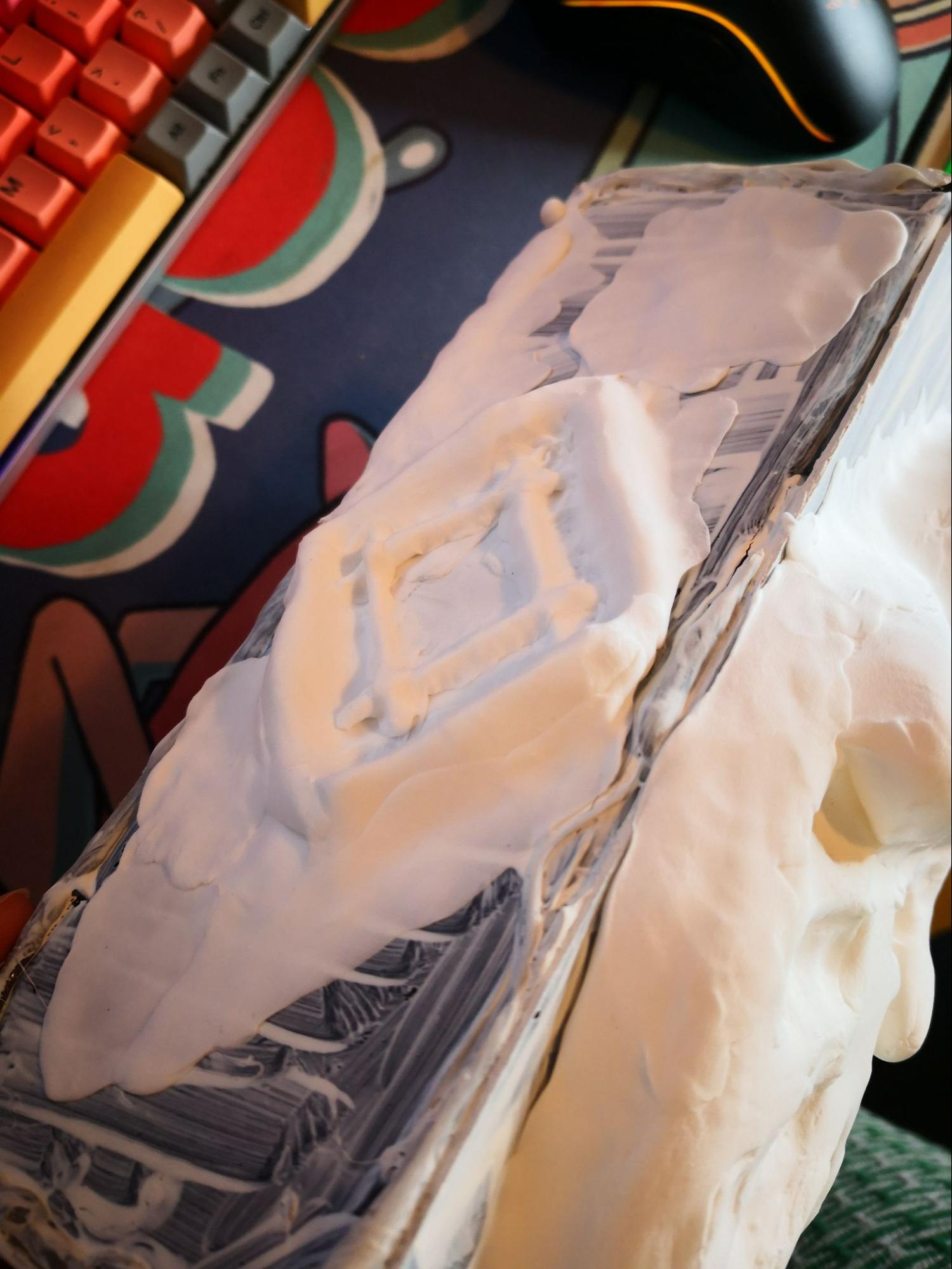 Once I have sculpted all of the ornaments, I’ll spray paint the box with a light blue color and then add texture and shading with acrylic paint.