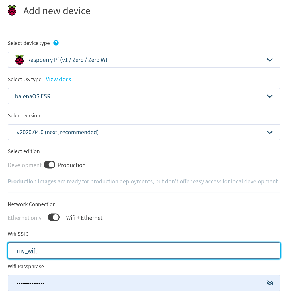 Add Device button to define and download the appropriate image for my Raspberry Pi Zero. I added my WiFi credentials, saved the .zip file to my workstation and flashed it to an SD card with