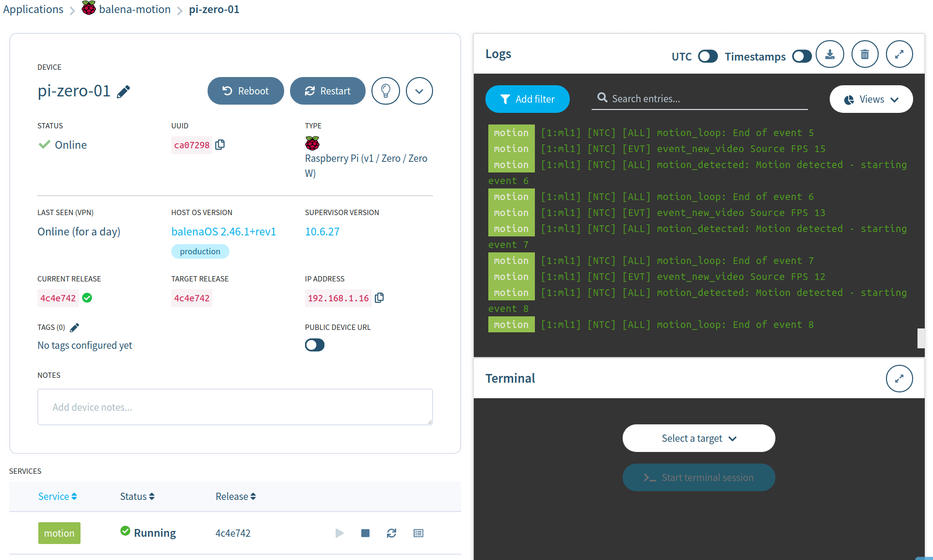 balenaOS and provides a dashboard for managing everything. It’s free for the first 10 devices, plenty for scattering TuckerCams around my house.