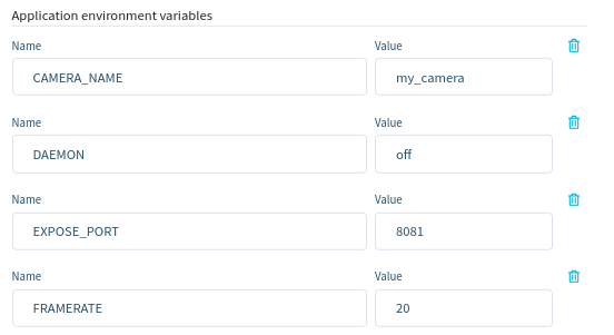 balenaCloud application itself. That lets me edit settings from the balenaCloud dashboard and apply the same variables to each new TuckerCam 2.0 device I add to my balenaCloud application. I can also override the values on a device-by-device basis without having to redeploy.