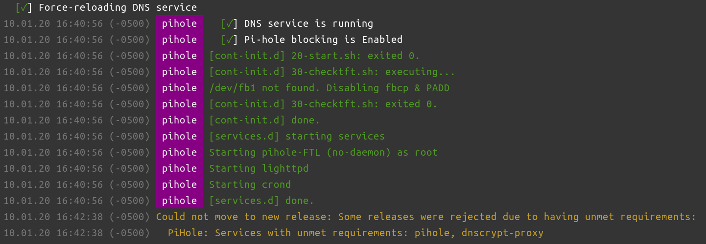 When I run balena push pihole, the build and upload continue normally, but a look at the balenaCloud dashboard logs reveals that though the container runs properly, the unmet container contract requirements prevented the container from being deployed: