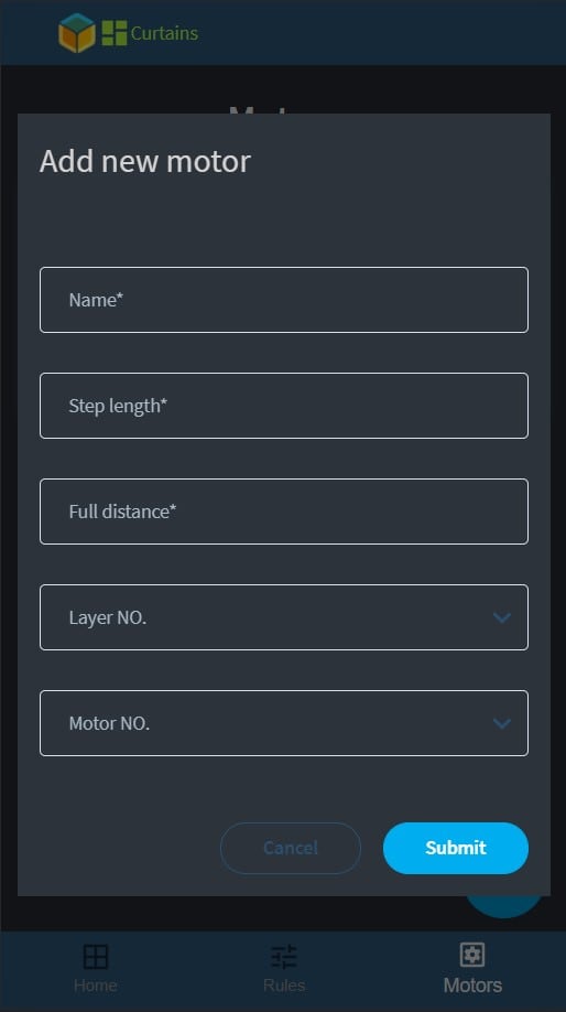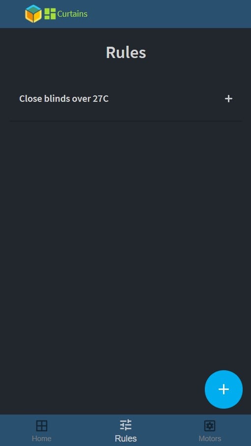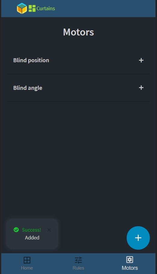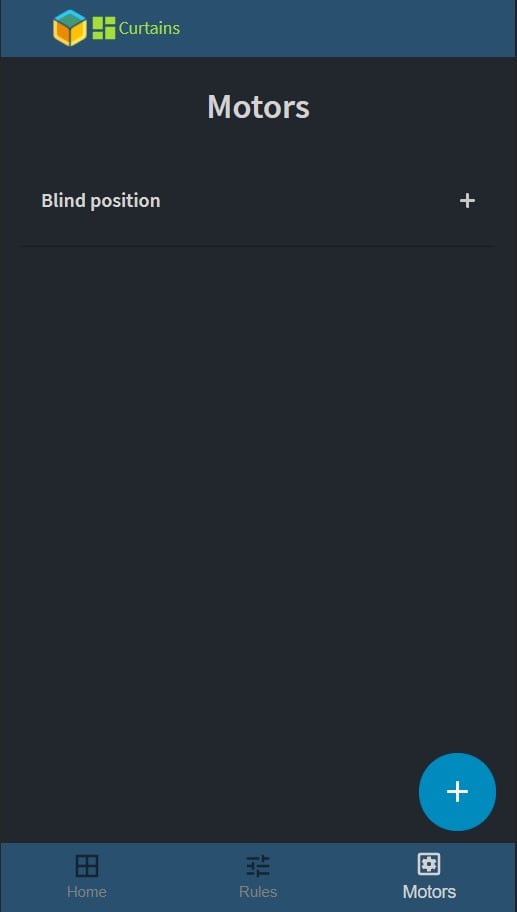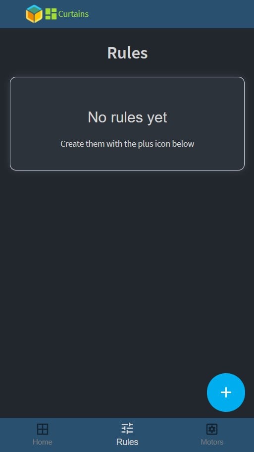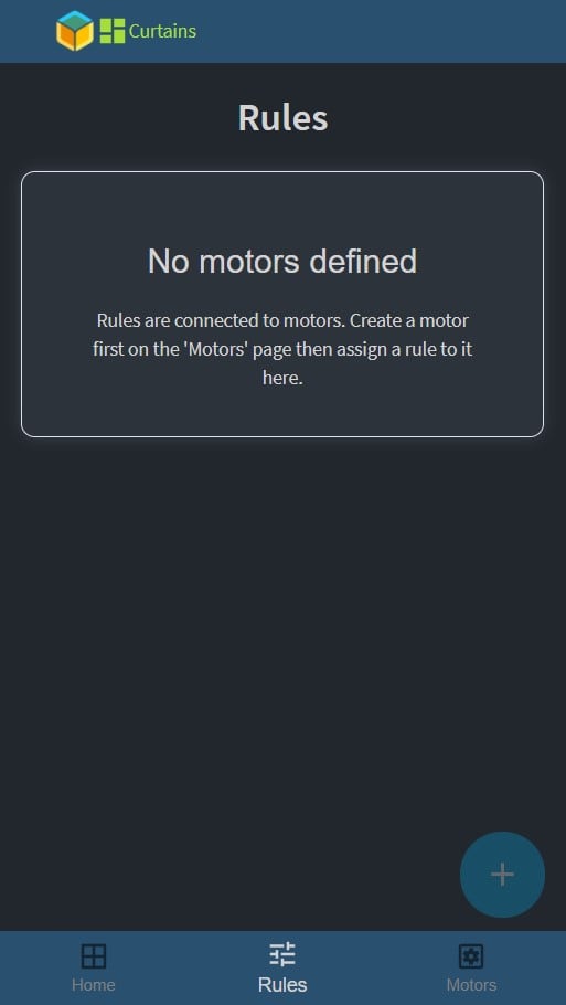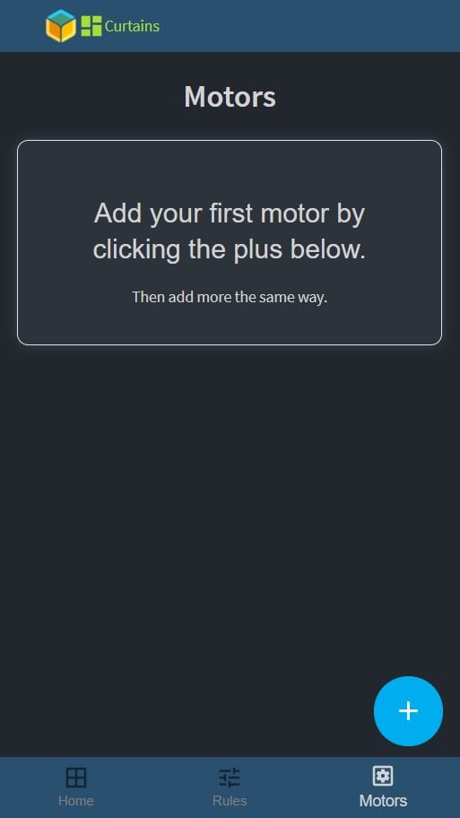 Opening the URL of your device an empty dashboard should appear, logo in the header and a bottom bar for navigation with three tabs, Home, Rules, and Motors. When the home page is empty, it suggests that you add motors on the motor tab.