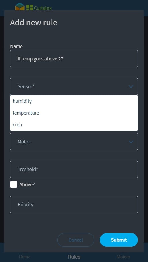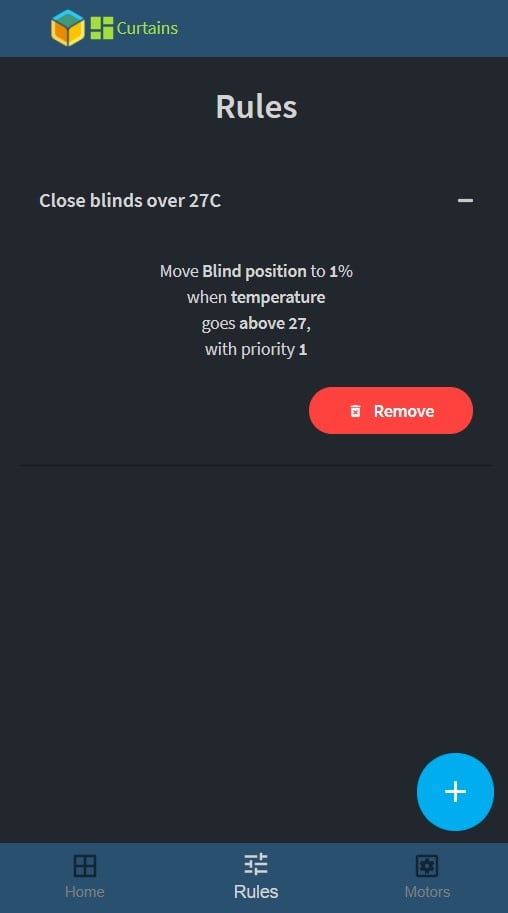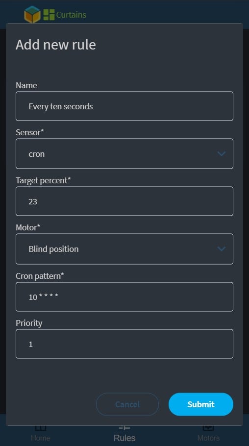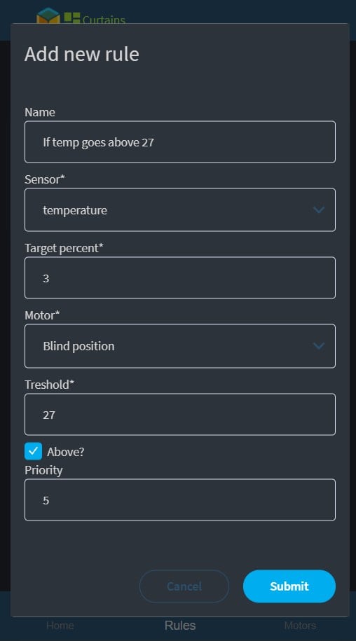 Timed (cron) rules have priority above sensor rules. Sensor rules work one way, meaning if you set up one to close the curtains when the temperature goes above 30 C, it won’t open them if it goes back below 30. You need to set that up separately.