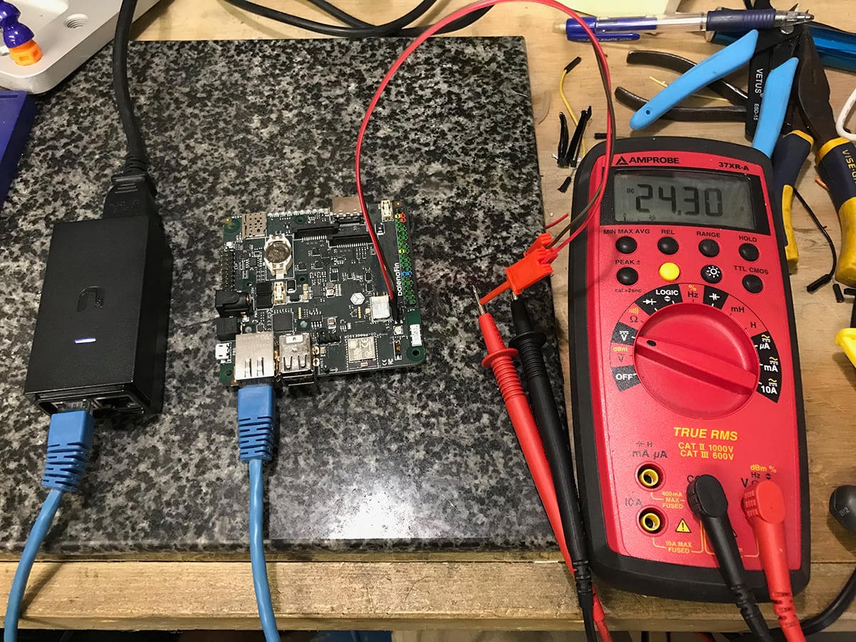 If, like me, you’re using a different HAT, you can consider the use of passive PoE; something which isn’t an option on the Raspberry Pi. The use of passive PoE without a HAT requires that the device have some method of regulating the input voltage. The Raspberry Pi requires a 5V input whereas the balenaFin accepts a range between 6-24V, meaning we can safely feed it 24V passive PoE. To do this we connect the PoE HAT pins directly to the power input of the Fin and use a 24V passive PoE injector or switch.