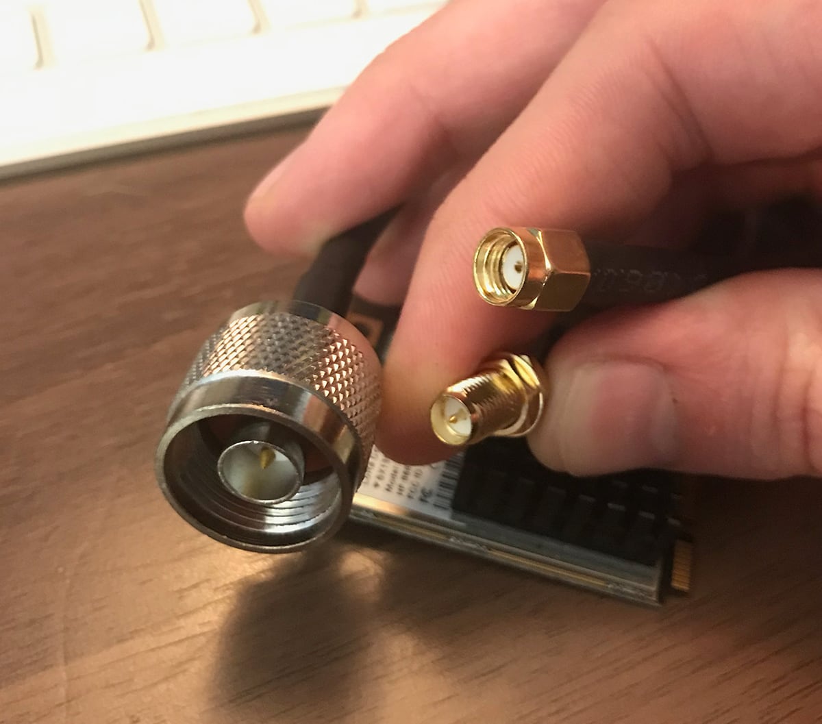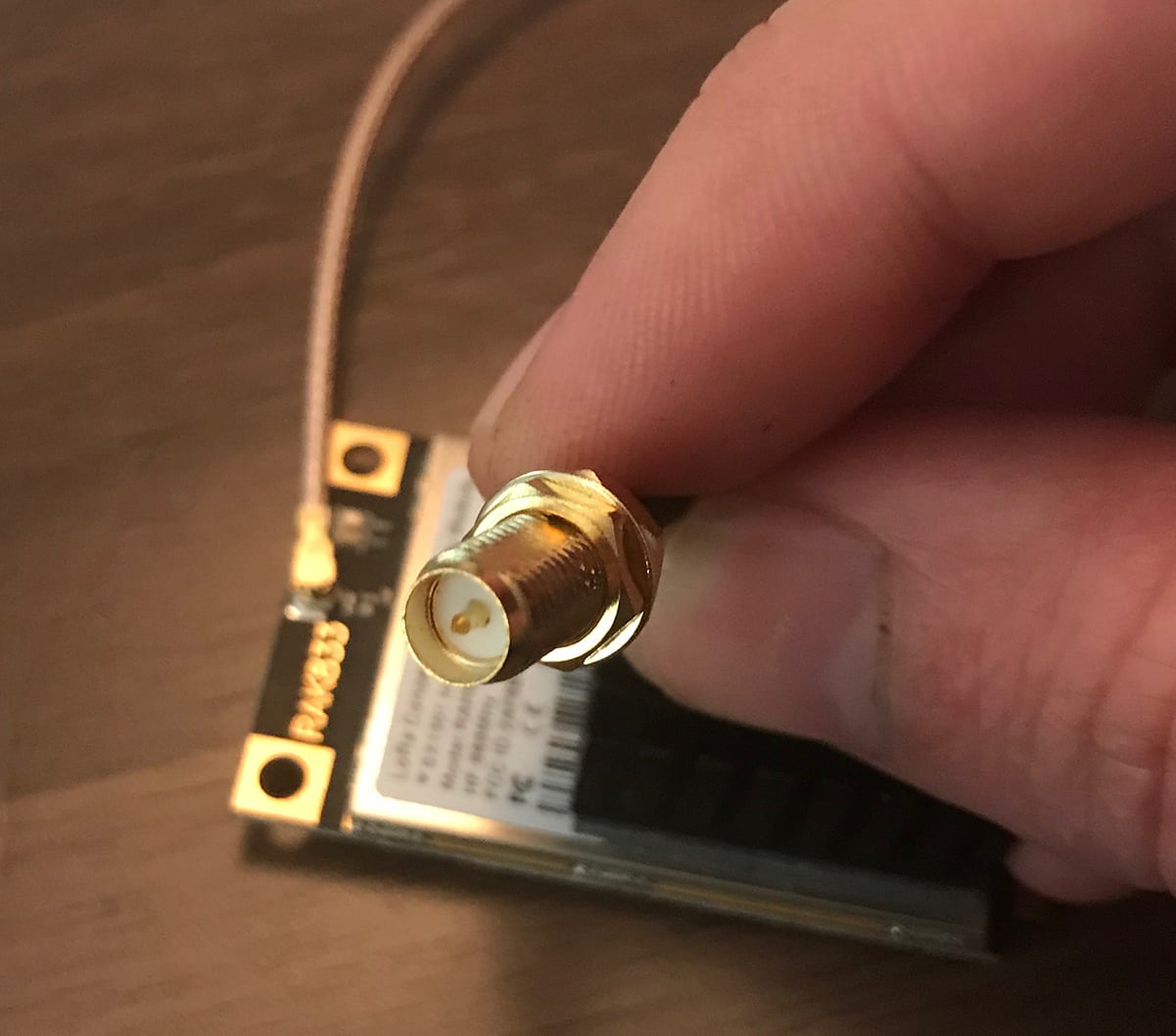 This antenna came fitted with a female Type N connector that needs to be converted into the U.FL/iPEX connector on-board the LoRa gateway module we installed into the mini-PCIe slot on the balenaFin