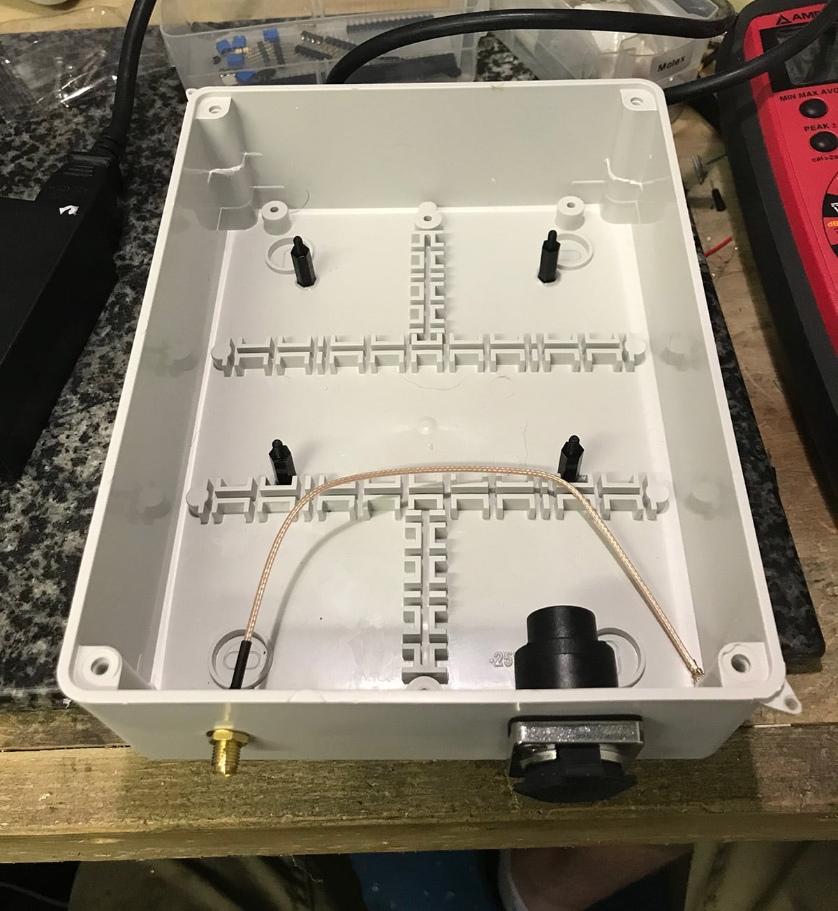 With this setup you have an easily maintainable installation, should the board fail or need maintenance to the mPCI-express card or the Raspberry Pi compute module on the rear, it’s easy to remove and replace. You can see how the threaded RF connector has been pushed through the hole in the enclosure and the nut fitted and tightened on the outside to provide a solid fixing and seal.