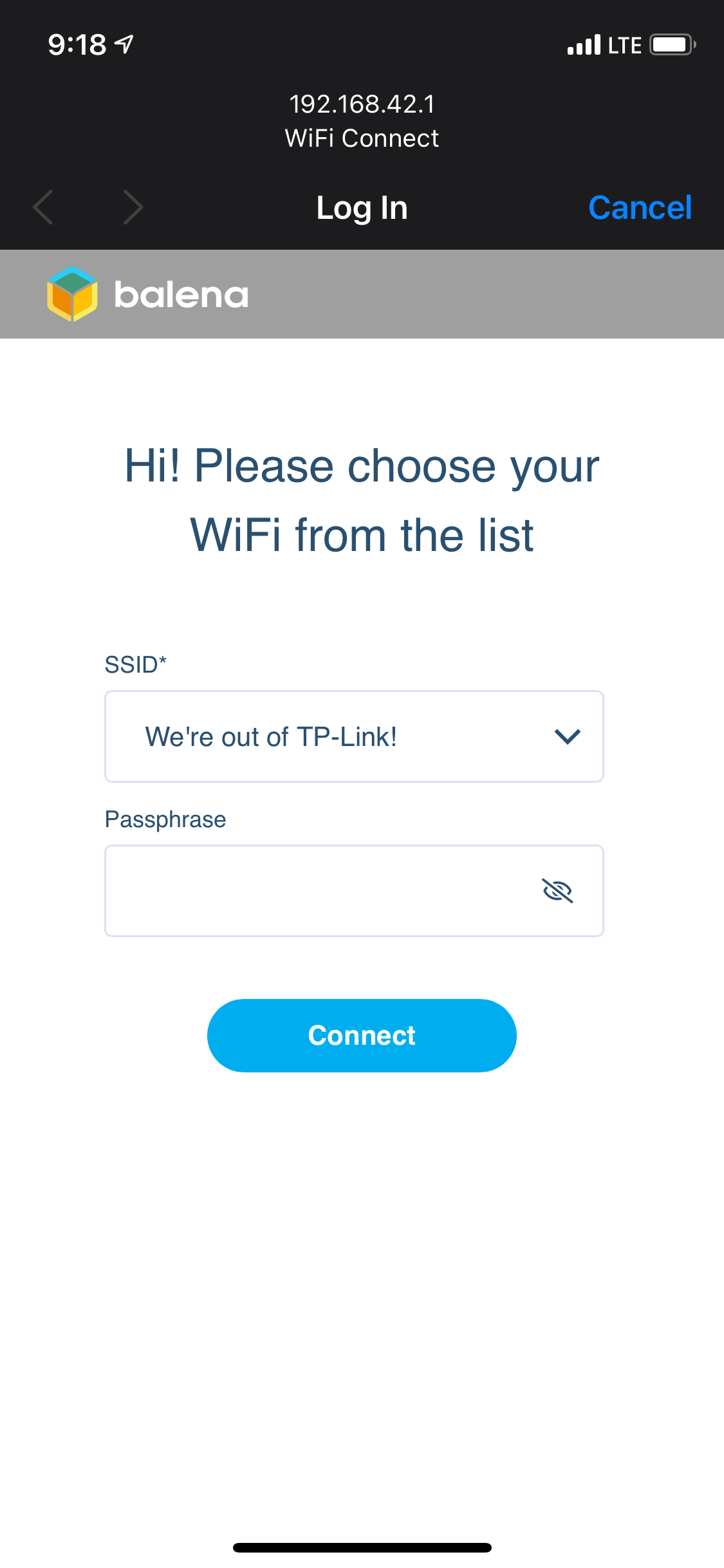 After the Frog sensor is connected to power, it will create a Hotspot called “WiFi Connect”. Connect to that hotspot network from a computer or smartphone to continue the setup.