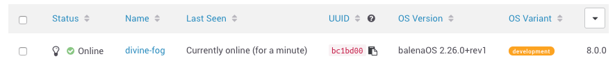 When the device boots for the first time, it connects to the dashboard, after which you’ll be able to see it listed as online and move onto the next step. Since we used deploy with balena to preload the application code, it should begin uploading the project to your newly added device.