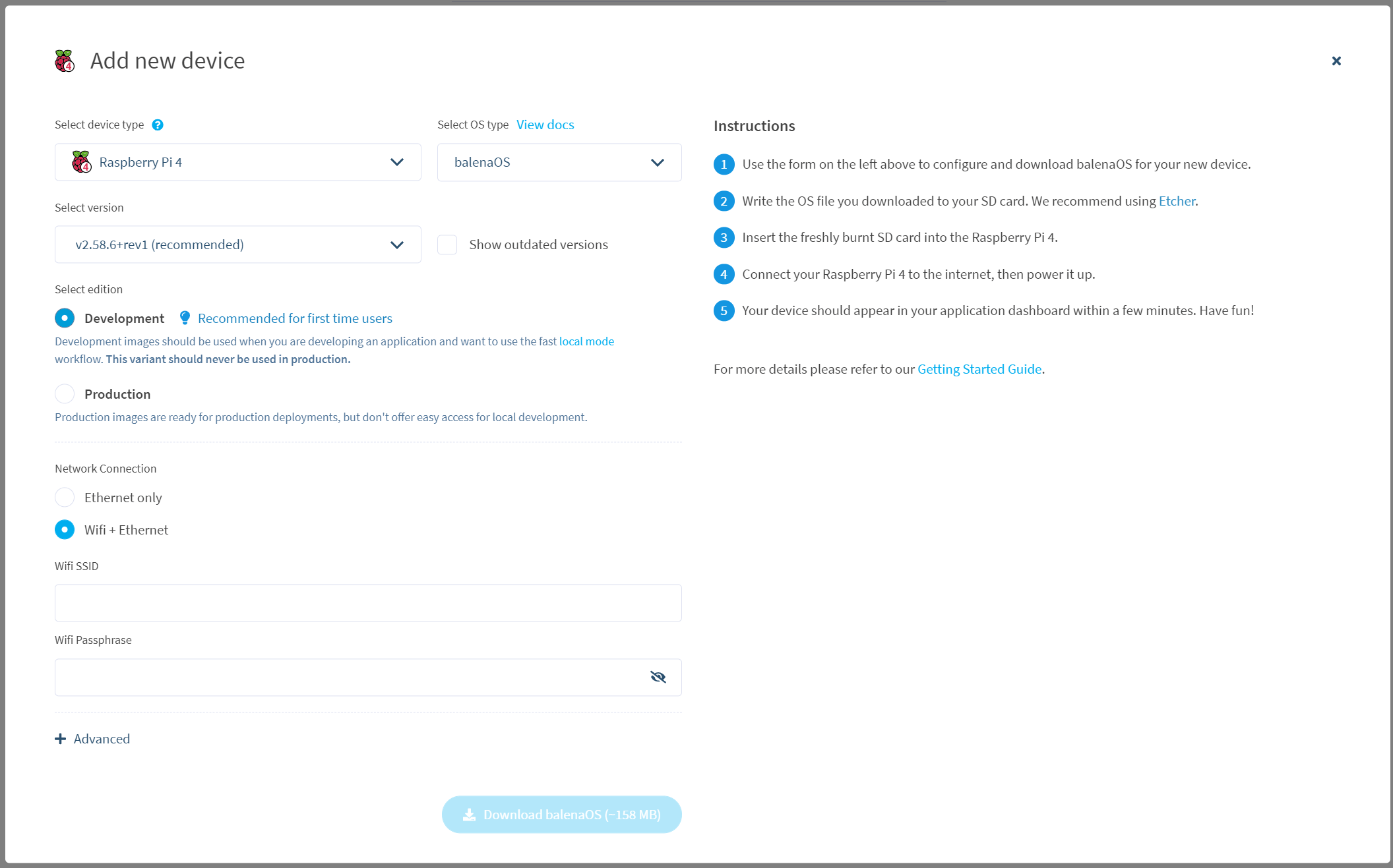 Once your application has been created using deploy with balena, you can setup and add a device within that application by clicking the 'add device' button. When you add a device you specify your device type, which in this case is a Raspberry Pi 4, and if you are connecting to a wireless network you can set your WiFI SSID and passphrase here too.