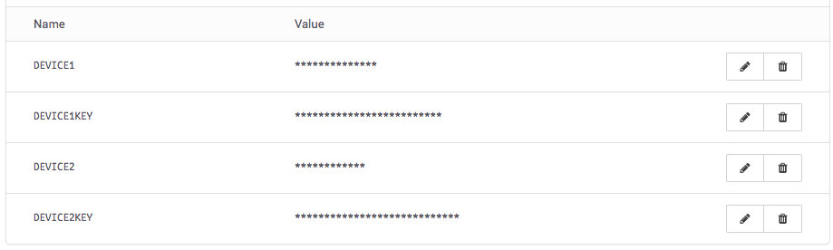 - Using the resin.io dashboard, store the simulated device IDs and keys as environment variables for the gateway device: