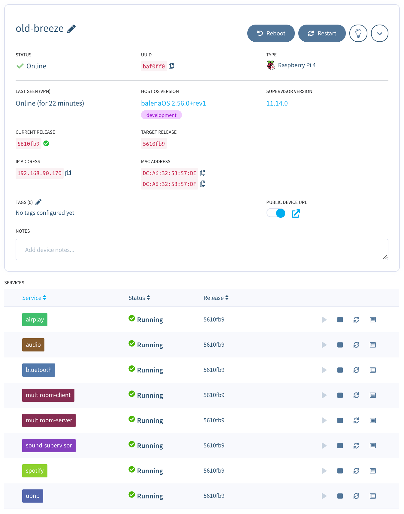 After the device appears online in the dashboard, it will start to download the balenaSound application; after a few minutes your device information screen in the dashboard should look something like this, showing the services running.