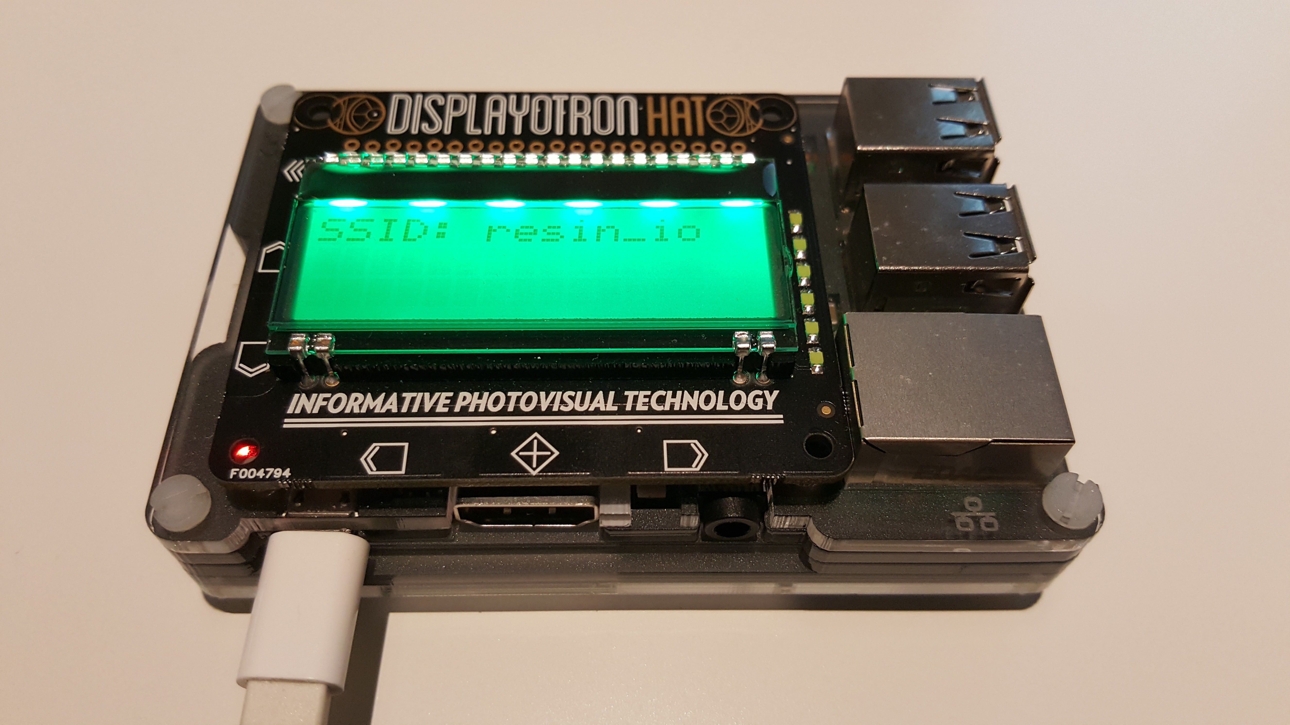 To try this example, assemble a Raspberry Pi with a Display-o-Tron HAT, download the host OS configured with your current wifi credentials, wait until the application is downloaded and the wifi network's SSID is shown on the screen, then press a button to put the device into access point mode. Connect to its network, ResinAP by default, open a website, and it will show you the captive portal where you can enter your new wifi credentials.